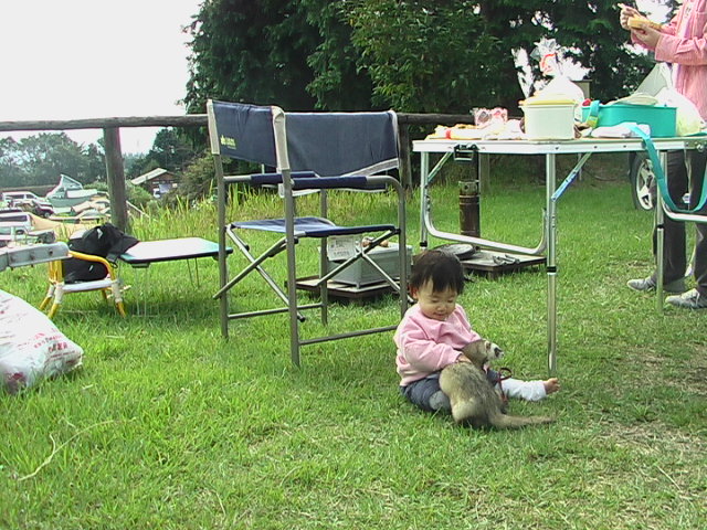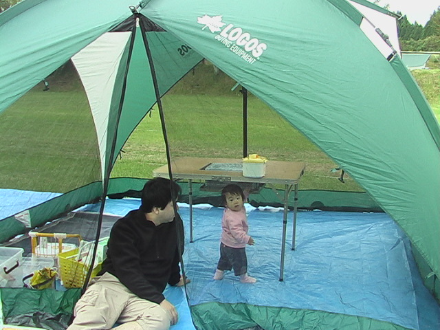 今回は夕食BBQの時、汐音がハイハイを自由に出来るようにブルーシートを下に敷いてみました。そして安全にBBQを楽しむ為にBBQテーブルと卓上コンロを購入。がしかし、やっぱり夕方から雨が降り出してしまいました。通り雨だろうと思っていたら、結構まとまった雨が寝る頃まで降り続け、ブルーシートの上は雨でビチャビチャ、とても汐音を遊ばせる事など出来ず抱っこしたままでの食事となりました。こんな事ならブルーシートを下に敷くのではなく上にかぶせておけばよかったなぁ… |