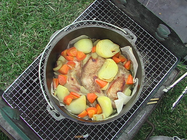 DO料理2回目。チキンを焼いてみました。これは大成功。みんなが魔法のオーブンというのがとてもよく解かりました。チキンはやわらかいし、野菜もとても甘くておいしくできました。 ただビールを飲みながらのんびり火にかけすぎたみたいで(約2時間)楽しみにしていたスープがほとんどなく次回への課題となってしまいました。トホホ |