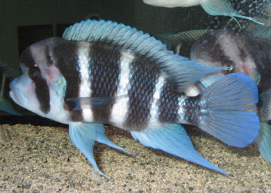 白地に黒のバンドがあり、状態がよいとヒレや顔がメタリックブルー