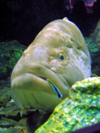 クエとホンソメホケベラ 共生関係にあり、口の周りの寄生虫を掃除してもらっている。 結構気持ちいいのか、恍惚の表情? |