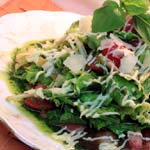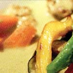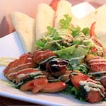 (スパイシーに焼いたチキンと野菜をトルティーヤに巻いて食べます)