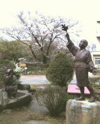 右 湯ヶ島小学校玄関前に設置された『しろばんば』のブロンズ像