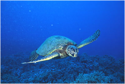 撮影場所:マウイ島 OLOWALU 被写体:カメ ここのポイントはカメが多いそうですが2匹しか見られませんでした。もう浮上しようかどうか悩んでいたところに、別チームのガイドに追っかけられてきたところを撮りました。 Nikonos V/20 mm F2.8/f5.6/1/90/RDP |
