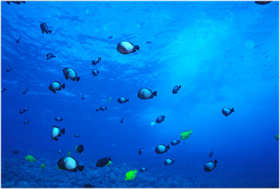 撮影場所:モロキニ島 被写体:ハワイアンダッシラス ミツボシクロスズメに似ています。中層にたくさんいました。混じっている黄色い魚はキイロハギで、これもハワイ固有種です。 Nikonos V/20 mm F2.8/f5.6/1/90/RDP |