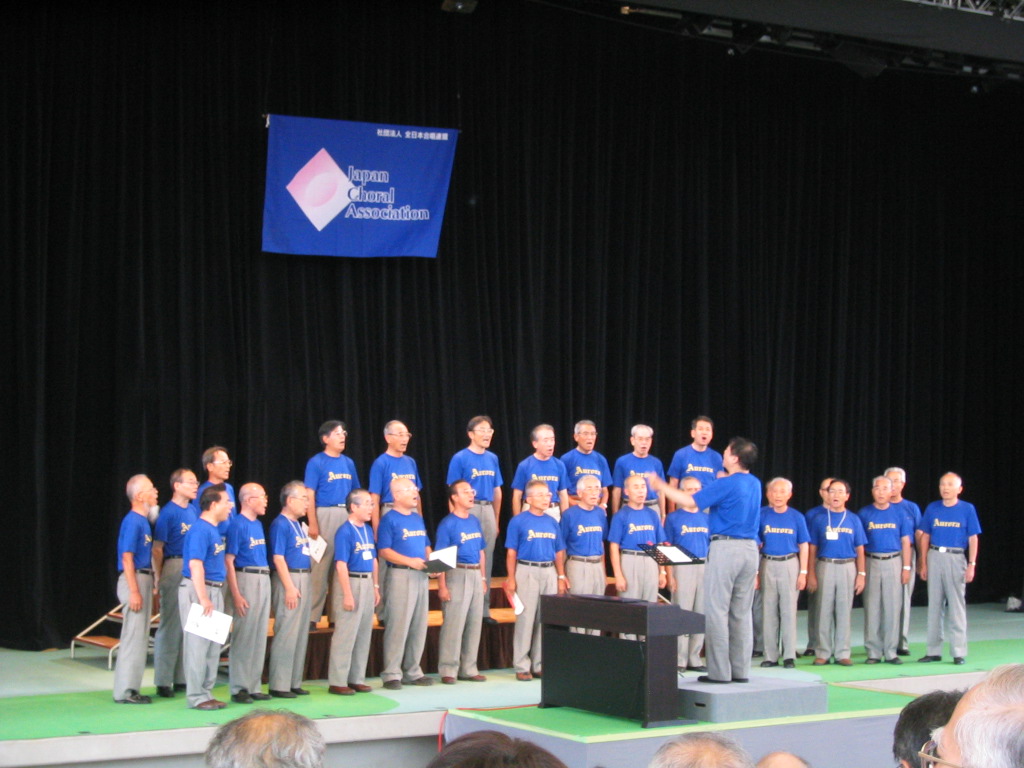 otousan14.jpg ここをクリックすると演奏画像になります。我が団発足から2年、浜名湖花博の開催期間中にお父さんコーラス大会が開催されました。我が合唱団も地元の男声合唱団として花を添えることになりました。花博会場の水辺の劇場にて8月7日(土)午後開催されました。関東方面の出場団体が高速道路の事故渋滞にて、多数遅刻する中、午前中リハーサル、午後ステージとなりました。男声合唱団の競い合いで