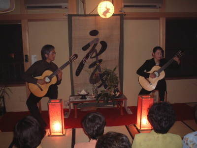 | 案内 | 日中は残暑の厳しいこの頃でございますが朝夕には秋を心待ちにした虫の音も聴こえるようになりました。中秋の名月には少し早いのですがお月見のコンサートを企画しました。 「寿庵」さんご用意のお月見の趣向と心尽くしのお料理をお楽しみいただき吉川二郎と野口久子のコンサートフラメンコギターで初秋のひとときをお過ごしいただきたくご案内いたします。 |