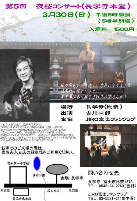 主催 JIRO富士ファンクラブ メール専用連絡先 kn@artdinner.com(JIRO富士ファンクラブ会長) 入場料 1500円 寒い冬もようやく終わり、桜の開花が待ち遠しい季節になりました。