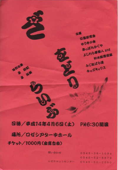 | 出演 | 日舞研究会 ゆうきの会 あっぱれかぐや よしわら夢祭人 and 和太鼓清流組 ふじ紅ばら連 キッズミックス 特別出演 泉 裕紀 泉 延樹 |