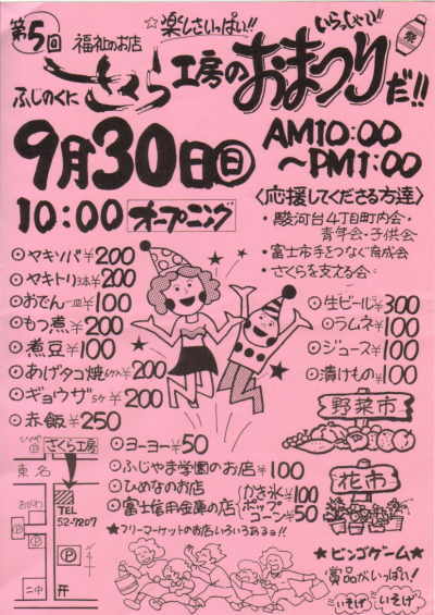 残暑御見舞い申しあげます 貴家におかれましては益々御清栄のこととお慶び申し上げます。 ふじのくにさくら工房も個人の福祉作業所として開設して早いもので5年と相成りました。 これひとえに皆様々のあたたかい御声援・御指導の賜ものと感謝いたしております。 さくらまつりをささやかではございますが、真心こめておもてなしをいたしたいと存じます。御多忙とは存じますが是非御御足をお運びいただきまして通所生にエールを送っていただきたく存じます。 心よりお越しをお待ち申し上げます。 ふじのくにさくら工房おまつり実行委員長 駿河台4丁目町内会会長 大石 勇一 富士市手をつなぐ育成会会長 斎藤 保春 さくらを支える会 ボランティアグループさくら |