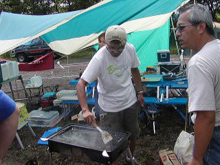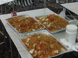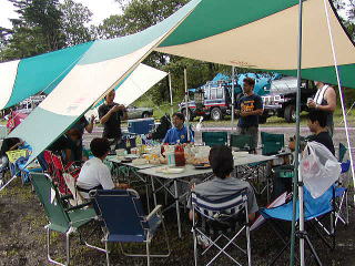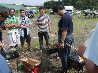 | 上っちゃったよっ!!! | さて、昼食の支度です。いつきさんとお友達が メインメニューの焼きそば作ってます。 |
