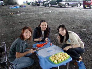 | tomさん特製の「ビーフシチュー」仕込中。 | 野菜切り中のギャルたち。 ん!?手に何やら怪しいものが・・・(^ ^; |