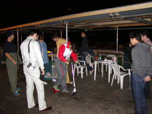 レース終了直後、電動キックボードに群がる 面々。T2さん試乗ちう。 |
