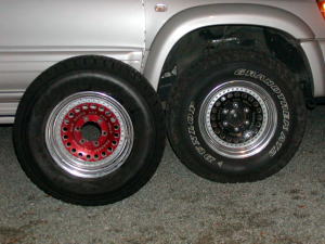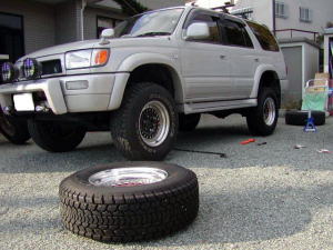 組み替えは、連れに頼んで某タイヤショップ にてやってもらいました。 で、とりあえず2つ並べてみました。 スタッドレスの方が小さいです。 |