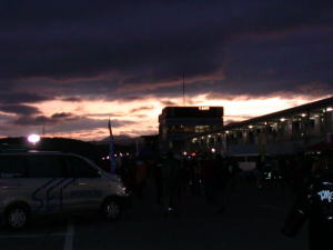 | 夕暮れのパドック。雨もなんとかもち、最後 には夕焼けが見られました。 |