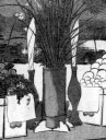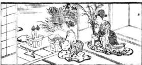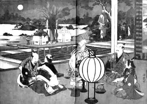 | 「八月十五夜の月を賞することは、嶋田 忠臣(平安時代の人。菅公の知人)の集に初めて見えたり。その年紀定かならずといへども、斎衡3年(856)詠史百四十六首を奉り、貞観元年(859)年調三百六十首を奉れるよし家集の自注に見えたれば、その時代大概知られたり。 この挿画は、元和頃武家看月の図とて、或人より寄たり。即ち、山水に富める東向きの座敷を以って看月の場となし、縁(えん)には、薦(こも)打ち敷き机を安置し、その中央に、尾花、紫苑を挿み、神酒を備い、左右には団子、柿、栗、芋、枝豆等を盛り、主客共に肩衣、袴を着け、前には酒肴又は菓子を陳ね(つらね)、団居(まどい)して(車座になって)、各筆を手にし、今日の今宵看月の興を催し、詩歌を弄ばんとて、皆々意匠を費す様なり。扈従(こじゅう)の若衆は、酒を助くる酌人なるべく、既にして名月東山の上に昇り、光輝皎々(こうこう)昼の如く、丸行灯の火影は打白みてあらすもかなと思ふならむ。 西行の歌に、 「秋は只、今宵ばかりの名なりけり、同じ雲井に、月は住めども」 |