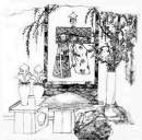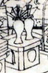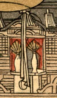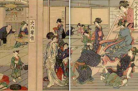 | 青楼は,江戸吉原遊郭の妓楼(女郎屋)のことで、内証(ないしょう)は、妓楼の主人夫婦のいる座敷です。妓楼では、3月(旧)、楼内慰安のために、晴天の日を選んで昼夜の営業を休み、遊女を上野、浅草、向島辺りへ花見に出し、外花見をしない店では、「内証の花見」と称してこれも昼夜営業を休み、なじみ客を招いて、遊女から若い者に至るまで、自由に遊ばせたとのことです。左上の、主人夫婦の後ろに、下が袋戸棚になっていて、上に、恵比寿、大黒、陽物などを祭り、商売繁盛を祈った神棚(縁起棚)があります。神前に、みきのくちが供えてあります。みきのくちの前に垂れている紐は上に鈴があり、鳴らして見世の始まりを知らせるもの(見世出しの鈴)です。 |