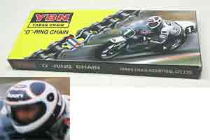 | 今日、チェーンが届きました。 連絡は遅かったけど、発送は早かったみたいです。 台湾YBN 社製でOリング仕様。 取り付けはクリップ式、525の120。 確かに箱の中にクリップが入っていました。なんか懐かしい感じです。 パッケージは、ロスマンズのレーサーが写っていますが、フルフェィスの中の顔は、契約の関係かぼかしが入っています。 いろいろ苦労があるみたいですね。 チェーンがクリップ式になったおかげで、スイングアームを外さずにすむので、楽勝です。 |