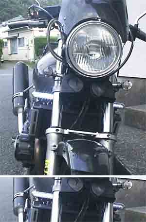 | ファンネルを取り付けました。 まず、取り外しの前に、工具を作ります。 取り付けねじのトップからファンネルの張り出し部分までが近いため、既存の6角レンチが入りません。 角から1センチほど残して切り落とします。 手探りでの作業となるので、少し多めに先端を落としておきます。 手前のねじを外し、ファンネルの間にある奥側のねじを少しずつ緩めます。 緩めながら、ファンネルを動かしてみて、ねじが抜ける前にファンネルを外します。 両側から二つずつ同じ手順で外します。 さっと掃除をして、新しいファンネルを取り付けます。 残しておいたねじのワッシャーを持ち上げながらファンネルを滑り込ませます。 奥のねじを外してしまうと、この後大変です。 内側の2本から順に取り付けてゆきます。 しっかり締めたら作業終了。 ちょっと試走に。 別に元とおんなじファンネルに取り替えただけだからなんの変わりもありません。 荒いネットにしたおかげでエアーの不足も無いみたいです。 そのせいでネットの効果は気休め程度。 フレームに見えてるタイラップがHIDのバラストです。 |