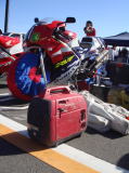 今回は昨年に続き、私が呼びかけ人となって『Force V4 owners' club』のクラブ員が大勢走行参加する事になりました。走行参加者の他に見学・手伝い・付き添いを含めると20名位の大所帯です。ライパではサーキットのピットガレージが参加者に開放されますが、我々は駐車場の12台分のスペースを占有してターフテント,椅子、マシン駐車スペースを確保してFV4ホスピタリーブースを設営。協賛ショップに負けない規模のブースとなりました。トランポにバイクを積んでの移動や自走のクラブ員が次々に到着します。誰に言われるでもなく暗黙の了解でバイクを整列していきます。綺麗に並べられた同じようなカラーリングのV4レプリカマシン群は、他の参加者とは一線を画しています。(笑)