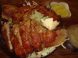 11:00過ぎになったので県道12号線で伊東市方面へ向かい、本日の最初の目的地である昼食場所の【宮城(みやしろと読みます)】さんへは11:20頃に到着。お目当ては以前、BikeJIN誌の伊豆の旨いもん丼特集で紹介された『ロース豚丼』です。千切りキャベツの上に盛られた分厚いロース肉が2枚。そして味のアクセントとなるバターと生ワサビを溶かしながら豪快に食べるのがお勧めです。この時に富士宮市在住のV4仲間からメールがあり「大将さん、さっき沼津IC近くにいました?」と、しっかりと目撃されていました。