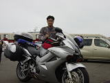 4:30起床、5:30に自宅を出発。今日は行きがけにForce V4 owners club関東地区会員の『おむすびさん』とモーニング・プチオフの予定。実は8耐のプログラムを渡す約束になっていたので用賀IC近くのファミレスで8:00に待ち合わせ。東名高速をは順調に走行していて気付いた事は、前に乗っていたサスチューニング済みのVFR800に比べ同じ積載状態でもフロント周りの接地感が抜群に良いという事。よりタンデム走行を想定して開発したという開発者の話は本当の様で、フロントカウルの尖ったデザインもダウンフォースを得る効果を発揮していると思われる。フルパワー化の恩恵もあり疲労が少ない事が確認できた。7:30頃に東京ICを通過したものの用賀出口までは大渋滞。出口手前1kmから路肩走行を決行するが後方より景気の良いサイレンの音が。「しまった!ロックオンされたか?」と思ったが、死角となる場所に停車してこれから取り締まる準備をし始めて事なきを得る。ちょうど8:00にデニーズに到着。店内に入ると『おむすびさん』はまだ到着していない様だ。携帯メールで到着したことを知らせると彼も程なくヘルメットを抱えて到着。「その格好のままバイクで仕事に行くの?」と私。「都内はバイクの方が楽なんです」と彼。モーニングセットを注文してオーナーズクラブの事とかレースの事とか新生鈴鹿サーキットの話題(F1を見に行くらしい)で盛り上がります。1時間半位、話し込んで駐車場で記念撮影。関東でもモーニング・オフは初めてなんだそうな。(オールナイトは頻繁にあるらしいケド・・・流石、眠らない街、TOKYOだ!)