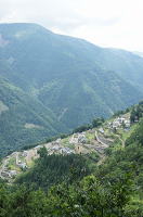 駐車場から急な坂道を歩いて行くと間もなく地元の方々が手作りで整備された小道への入口が現れます。人ひとりが通れるほどの舗装もされていない山道です。手すりやフェンスは心もとない程度のものしかありません。滑落したくなかったらそれなりの服装で行き、すれ違う時は譲り合いましょう。そんな山道を息を切らせながら歩くこと約15分。行き止まりとなる場所から見る光景は、【引越しのサカイ】のCMで有名となった『日本のチロル』と称される集落です。ここ数ヶ月、BikeJIN誌や他のツーリング情報誌で多く取り上げられた事でライダーの数が非常に多かったデス。まぁ、ボクもその一人ですけど。