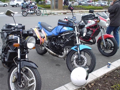 今回の集合場所である「道の駅どうし」は山奥の道の駅ということもあってか、いつも駐車場に入りきれない4輪車があふれている所です。特に週末の午前中は関東からのツーリングの集合場所や休憩地点に活用されることも多いようで2輪車も相当な数が集結していました。殆どがハーレーかハーレーもどき、ドゥカや最新のリッターレプリカ、カワサキZ系などであり2ストはもちろん中型バイクを見かけるコト自体が珍しい状況でした。 |
