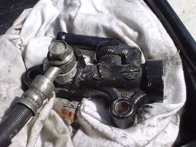 んがっ!コレは何用なんだ??RZRのキャリパーサポートにあてがってみるとホース取出口がココでは付かない・・・ |