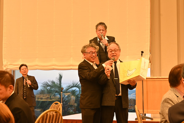 懇親会では会員氏名ビンゴ大会が行われ、大いに盛り上がりました。静岡地区は千葉県産の落花生焼酎と鳩サブレーをGET! |