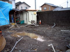 コンクリートがかなり消え、土の部分が多く露出してきました。左の写真の左端に残っているコンクリートの下には離れの生活排水が下水管へと導かれる汚水管が埋設されています。 |