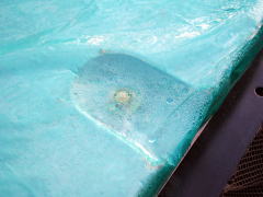 ALC(Autoclaved Lightweight Concrete:軽量気泡コンクリート)は、ビニールシートで養生されていてビニールがALCにステープルで固定されています。しかしながら、予想とおりにALCが水を吸ってしまったと思われるシミが発見されました。一見してシミとわかる部分は三箇所程度しかなくて、もっと激しい大量のシミをホームページを公開している方がいらっしゃるのを考えると意外に軽症だなと感じました。
