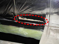 二階の施工を見てみると、木枠パネル表面のアルミのシートに破れた痕が多々見受けられました。保管・搬入時に傷つけたのか、施工時の取り扱いが荒くて傷ついたのかわかりませんが、後者だとしたら建築を急いでいないから丁寧にやってほしいな。最後にアルミテープで補修するのだから関係無いって言ってしまえばそれまでだけど...。建物の根幹に影響するようなことではないけれど、やっぱ、施主としては気になりますね。