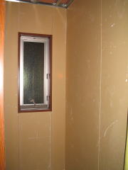 ウォークインクローゼットの入り口、赤い点線で囲った石膏ボードも今日貼られました。(写真左)結構、角は凸凹が激しいです。